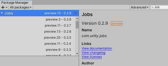 ▶ PackageManager에서 Jobs Preview Package를 Import하면 IJobParallelFor의 확장형 인터페이스를 추가로 사용할 수 있다.