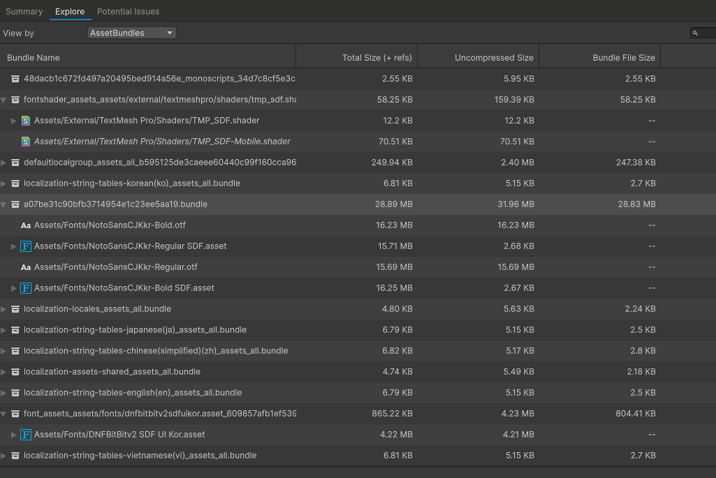 - 공용으로 사용해야하는 폰트 (채팅, 닉네임과 같이 사용자에 의해 만들어지는 폰트)는 따로 어드레서블 그룹으로 묶음