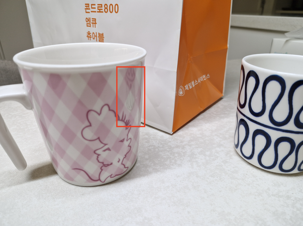 : 광원의 빛이 종이 박스의 주황색 영역에 닿고, 주황색 영역에 닿은 빛이 다시 컵에 난반사되어 컵에 주황색 빛이 보이게 됨