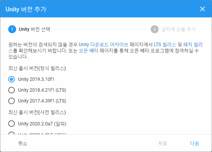 Unity hub를 통해 사용자는 Unity Editor의 버전과 프로젝트를 관리할 수 있음