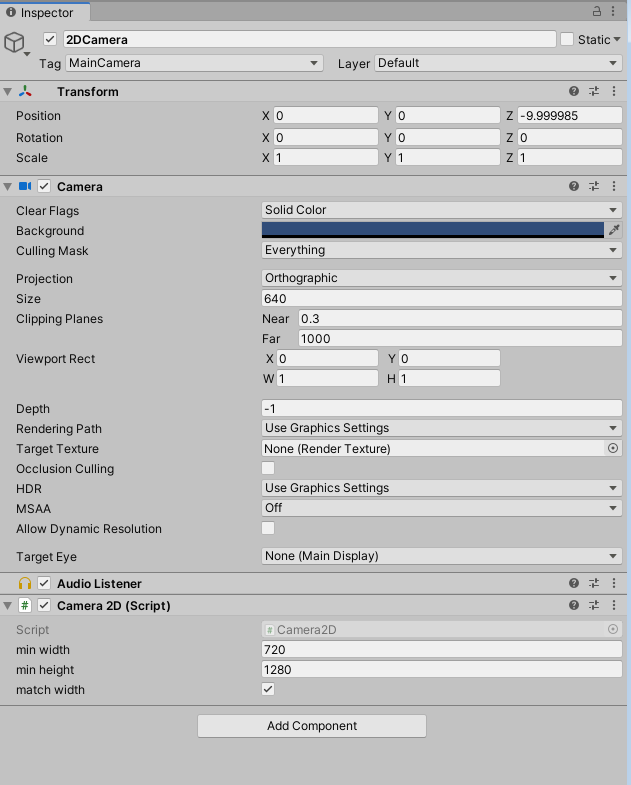 ▶ 2DCamera 게임 오브젝트를 선택 후, 게임에 맞는 기준 해상도를 설정