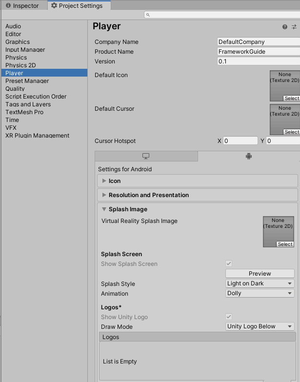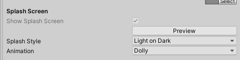 ▶ Splash Style : Unity 로고의 배경색과 글자 색을 설정, Light on Dark / Dark on Light 선택 가능