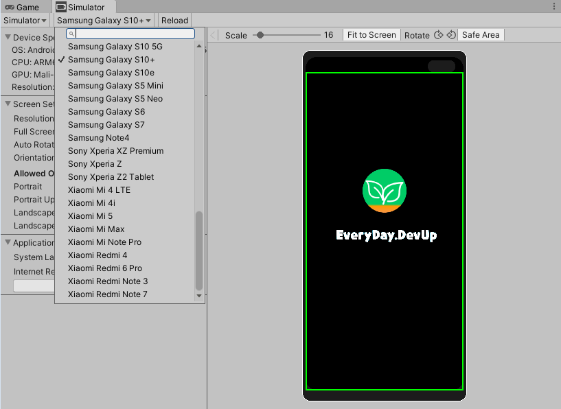 : 디바이스 시뮬레이터를 사용하면, 빌드를 하지 않고도 단말기에 따른 해상도 및 Safe Area를 확인 할수 있음
