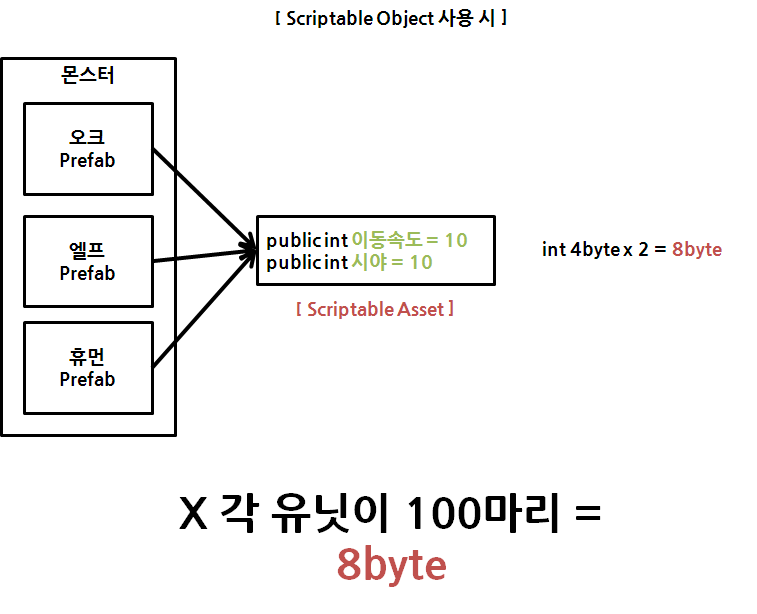 : ScriptableObject는 데이터를 참조 형태로 오브젝트에서 가져올 수 있게 함으로써 메모리 할당을 최소화하고 고유한 값을 가질 수 있게함