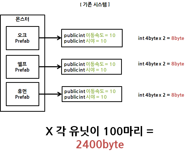 : 기존 시스템은 하나의 컴포넌트에 변수를 정의하면 프리팹을 인스터싱해서 만드는 만큼 메모리 할당이 발생