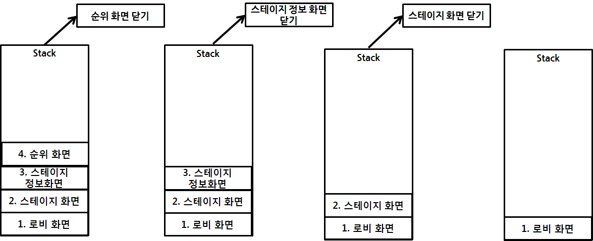 : 유저의 상호작용에 의해 변화되는 화면이 안드로이드의 Activity 관리 ( Stack )와 동일함을 알 수 있다.
