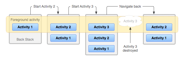 : 위의 그림에서 볼 수 있듯이 Activity 1이 있는 상태에서 Activity 2가 들어오면 Activity 1 위에 쌓이고, Activity 3이 들어오면 Acivitiy 2 위에 쌓이는 형태에서, Back 버튼을 누르면 가장 위에 있는 Activity3 이 없어지는 것을 볼 수 있다.