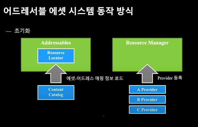 - Asset을 불러올 때 address ( 사용자가 정한 이름 ) 에 따라 Asset이 Resources에 위치하던지, Asset Bundle에 위치하던지에 관계 없이 쉽게 불러와서 사용할 수 있는 시스템