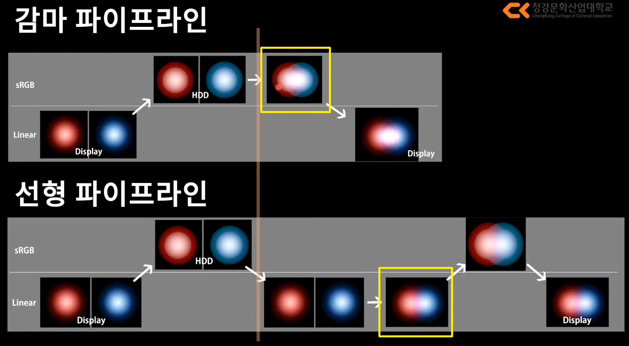 : 리니어 색공간에서는 어둡게 처리된 이미지 2개가 합쳐진 후 다시 밝게 이미지가 처리되었다가, 모니터에 출력될 때는 다시 어둡게 처리가 됨