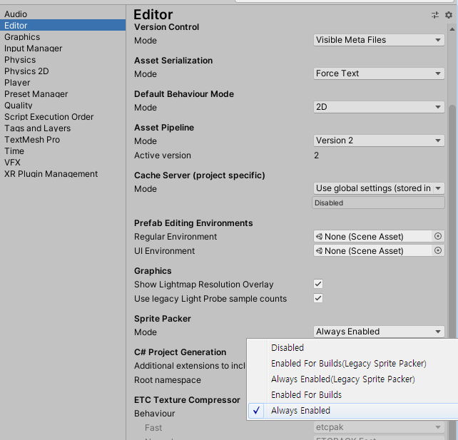 : Project Settings -> Editor -> Sprite Packer-> Mode는 총 5가지를 제공한다.