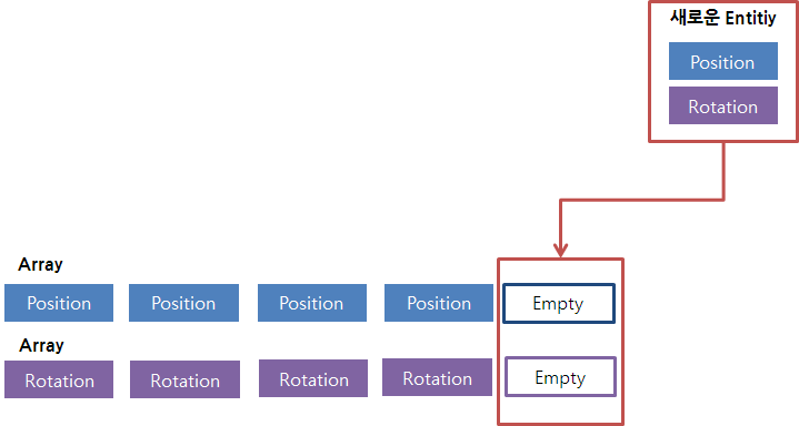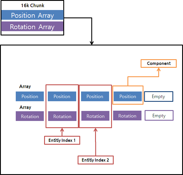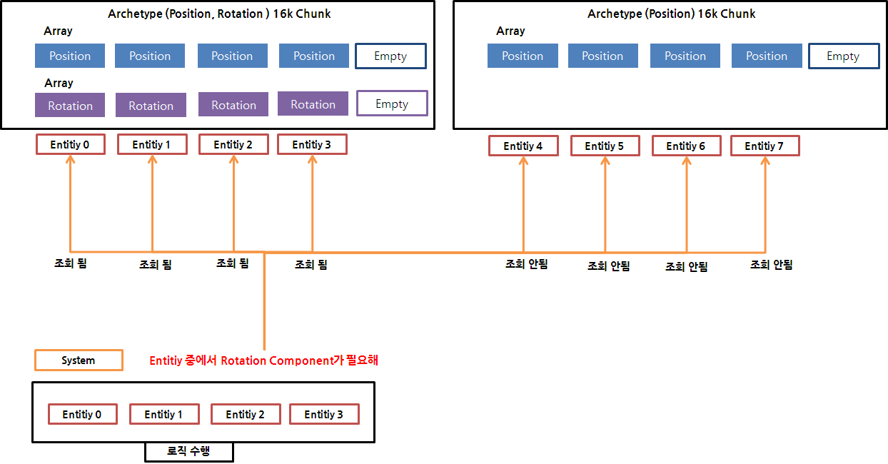 : 공통 된 Component를 묶은 데이터, 예를 들어 Position, Rotation, Renderer 데이터를 사용하는 경우 Archetype ( Position, Rotation, Renderer )에서 데이터를 관리하고, Position, Rotation데이터를 사용하는 경우 Archetype ( Position, Rotation )에서 데이터를 관리한다.