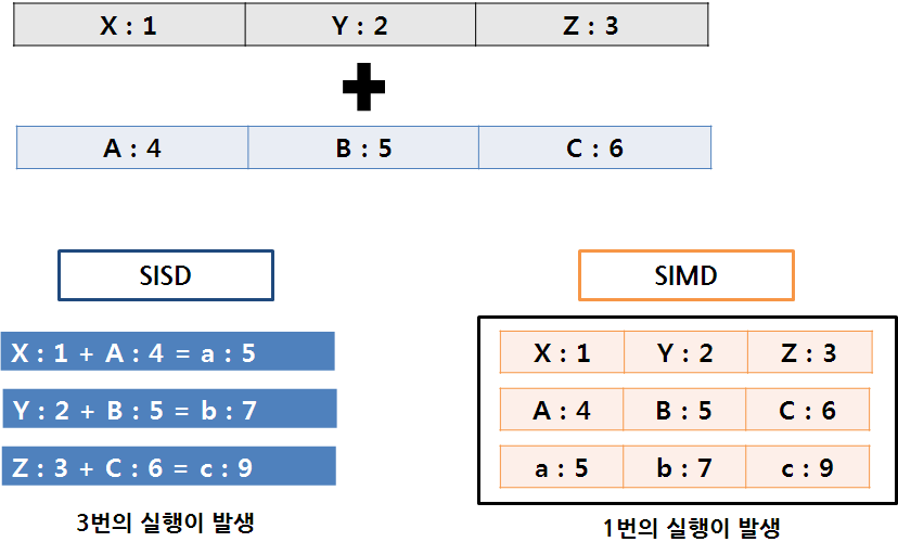 : 하나의 명령어로 여러개의 데이터를 한번에 처리하는 기법을 일반적인 프로그램은 SISD ( Single Instruction Single Data )로 구현되어 있기 때문에 CPU의 성능을 100%로 사용할 수는 없다.