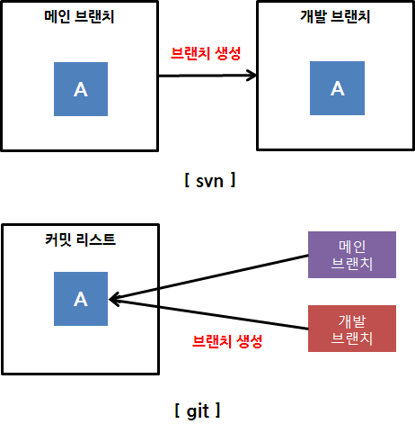 : svn은 브랜치에서 수정한 내용을 머지할 때 변경 사항 자체를 머지한다. git은 변경 사항에 해당 되는 새로운 커밋을 만들고 메인 브랜치가 새로운 커밋을 가리킬 수 있도록 한다. ( git에서의 브랜치는 커밋을 가리키는 하나의 표시라고 볼 수 있다. )