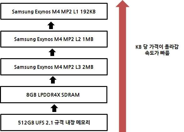 : L3, L2, L1 각 사이에도 속도의 차이가 있으며, L3 -> L1으로 갈수록 가격이 비싸지기 때문에, 가격에 비례하여 용량이 작아진다.