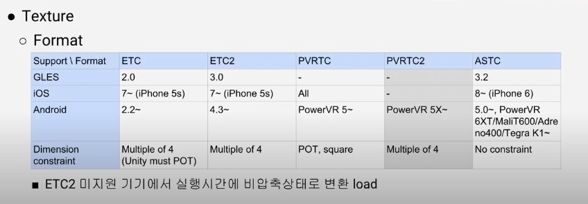 Unity에서 메모리에 영향을 줄 수 있는 어셋의 설정은 다음과 같다.